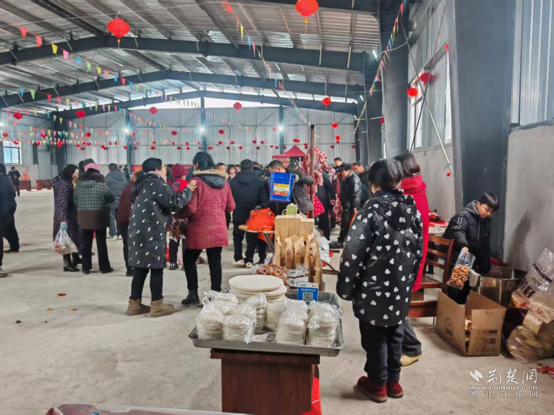 荆楚网(湖北日报网)讯(通讯员 毛红平 李晋莉)1月31日,红安县高桥镇兵和农场广场年味浓郁,百姓新春年货节正式拉开帷幕。新鲜牛羊肉、香酥鸭、刺梨干、糍粑、山茶油等20余种农家特产琳琅满目,非遗美食、传统工艺展示精彩纷呈,吸引武汉市民及周边村民100余人现场选购,线上订单同步火爆,累计实现销售额40多万元,为新春消费市场注入强劲活力。