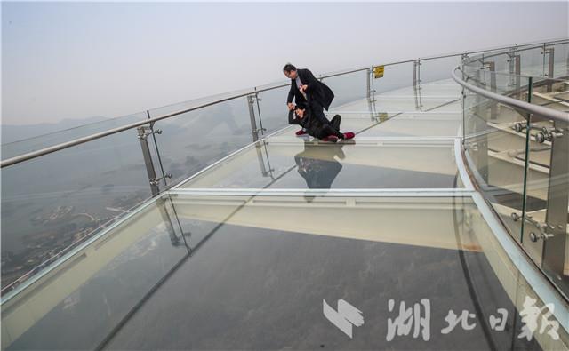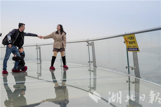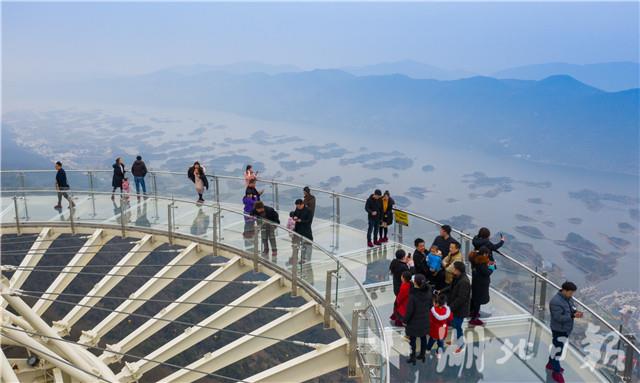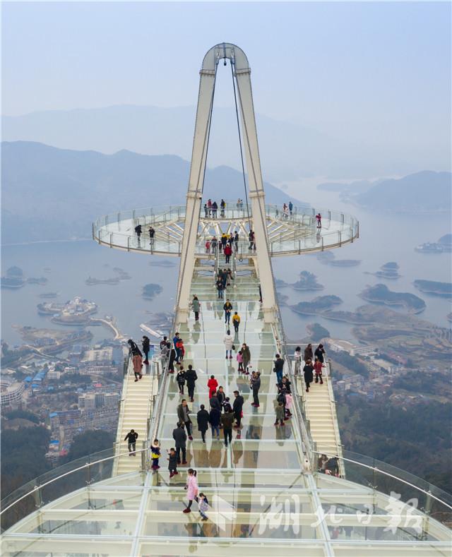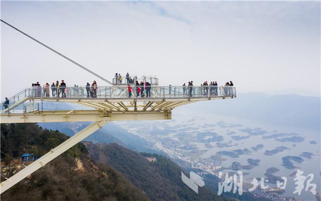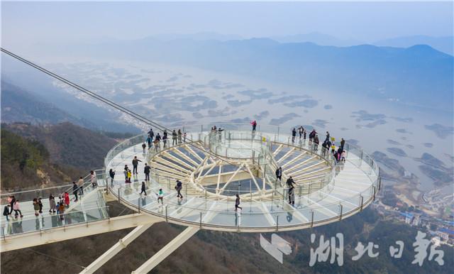 1月26日,游客在透明玻璃观景平台上观赏仙岛湖风光。当天,位于阳新仙岛湖北岸山麓的“天空之镜”玻璃观景平台正式投入使用,吸引了众多游客前来观光。该观景平台位于海拔520余米的千里山山顶,游客站在平台上可将仙岛湖千岛胜景尽收眼底。“天空之境”玻璃观景平台采用国际顶尖技术,在玻璃面积、海拔高度、悬索跨度、技术难度等多项指标上挑战世界一流水平,直径26.8米,面积564平方米,相当于1.5个标准蓝球场,为全球最大玻璃圆盘。观景平台从悬崖挑出49.5米,是美国科罗拉大峡谷21.34米悬挑玻璃平台的两倍多。(湖北日报全媒记者柯皓、通讯员田赪摄)