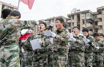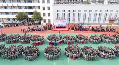 昨日下午,黄石十四中教育集团举行中考誓师大会暨阳光少年综合实践活动结营仪式。1200名初三学子经过两天半的实践活动后,齐聚操场,身着迷彩服,在该校领导、老师和父母的共同见证下,以全新的面貌跨入中考的最后阶段,铮铮誓言响彻校园,吹响了中考冲刺的号角。