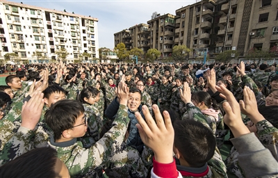 “加油!”九年级的各班班主任热情地跟每一名学生击掌,鼓励同学们坚定信念,共同进步。