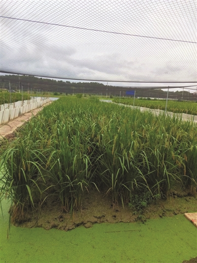 在黑色防鸟网的覆盖下,50亩的巨型稻仿佛一棵棵小树苗一样,随风摇曳,不时还可看见小青蛙穿行其间。普通的水稻品种一般高度都在1米左右,巨型稻个高、茎粗、叶茂,普遍长到了一米六左右,让长期和水稻打交道的农业人员也啧啧称奇。