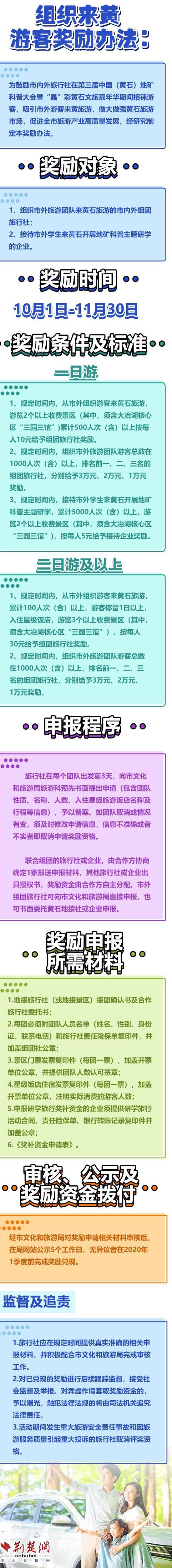 荆楚网客户端—荆楚网消息(记者吕鉴蕾)9月27日,记者从黄石市文旅局了解到,10月1日-11月30日期间,国内外旅行社、企业组织团队来黄开展一日游或多日游(含二日游),只要满足相应条件,即可获得现金奖励。