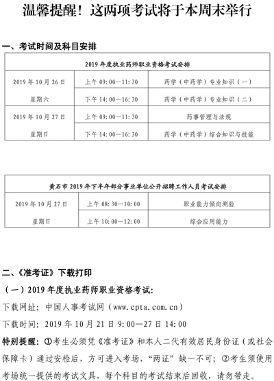 本报讯(东楚晚报记者阮瑞祺通讯员王蕊娜张晶)东楚晚报记者昨从黄石市人事考试院获悉,黄石将于本周末举办2019年度执业药师职业资格考试、黄石市2019年下半年部分事业单位公开招聘工作人员考试。