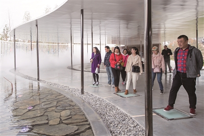 现场导游介绍,开园以来,“黄石园”的跳跳泉水景互动区已成人气打卡点。泉水边,游客脚踩踏板,泉水随节奏跃然而起。与此同时,带有浓浓历史感的炼铜声也会响起。倏忽之间,泉中云雾缭绕,踩踏声、水珠坠落声、炼铜声在雾中交汇,宛若仙境,令人沉醉。