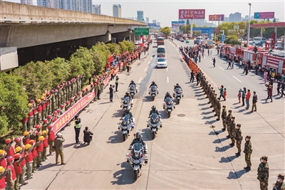 在欢送的队列中,警察还承担着维护秩序的职责,每一辆车过,他们都站得笔挺,行礼致敬;环卫工人们停下了手中的工作,注目沿途经过的大巴车以及车上的白衣战士;孩子们摇动着手中的小国旗,以此来感谢这些“打怪兽”的叔叔阿姨们……