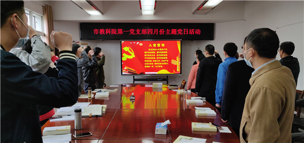 活动中,党员们面对党旗重温誓词。支部书记冯思燕同志带领大家学习了2020年3月6日习近平在决战决胜脱贫攻坚座谈会上的讲话,学习了优秀共产党员曹祥木抗疫期间不畏病痛、冲锋在前的感人事迹。同时,支部还就防疫期间市教科院党员同志响应号召,积极到社区报道,参与卡口值守、送菜送药、信息报送等服务工作进行了总结,4名党员被社区考核为“优秀”等次,发挥了党员先锋模范作用。