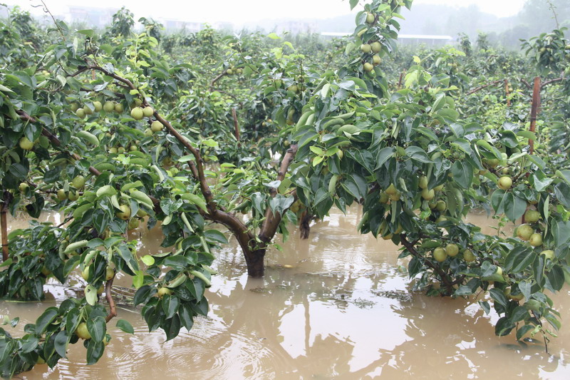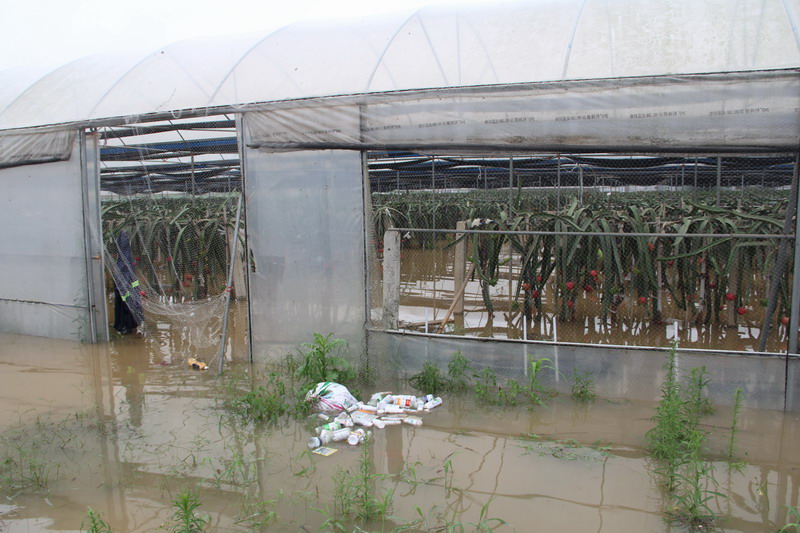 “目前损失最大的是基地200亩蔬菜基本绝收,2016年投资上百万元种植的80亩大棚火龙果正式进入丰产期,预计今年可收入60万元以上,60多亩梨树上挂满了喜人的果实,同火龙果一样,有35亩被洪水浸泡一米多深,如果再在洪水里泡上一昼夜损失将不堪设想!”基地负责人李群英心急如焚地介绍。