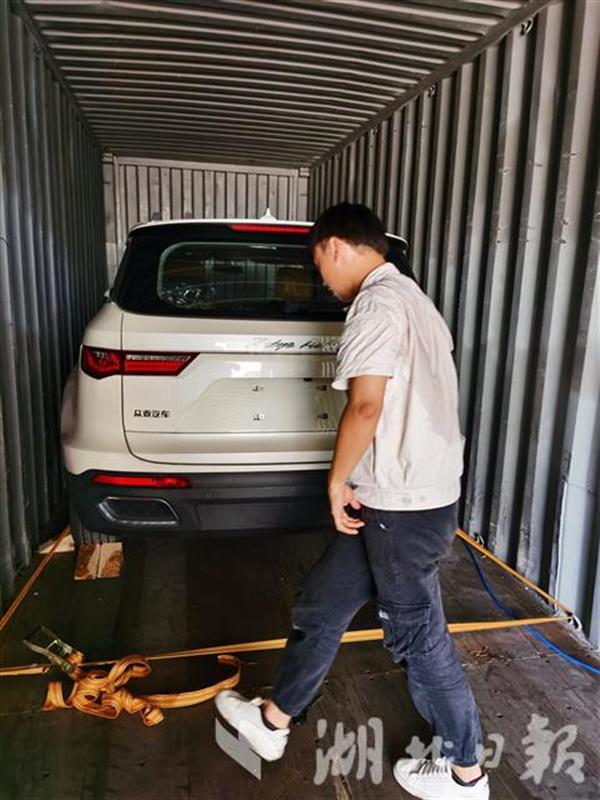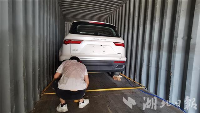 湖北日报全媒记者在装箱现场看到,集装箱货车开到平台下停稳开箱,停放在平台上的新车依次开进箱内,每个集装箱可装2辆车。25岁的胡卓将车开进集装箱后,左右侧车门无法打开,只能打开后备箱慢慢爬出来。21岁的曹志鹏则忙着加塞木块、绑扎绳索,固定车辆。集装箱内温度很高,工作人员跑进跑出,浑身是汗。
