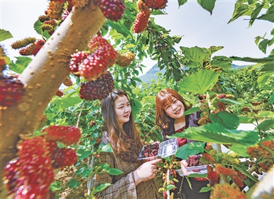 游客在富池港下村采摘桑葚