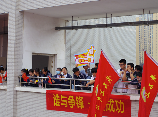 “黄石七中我爱你,全力迎考回报你”、“高三加油,高考必胜”“谁与争锋,一定成功”……现场,彩旗飞扬、横幅高挂,同学们以楼层为单位分小组喊出青春宣言。