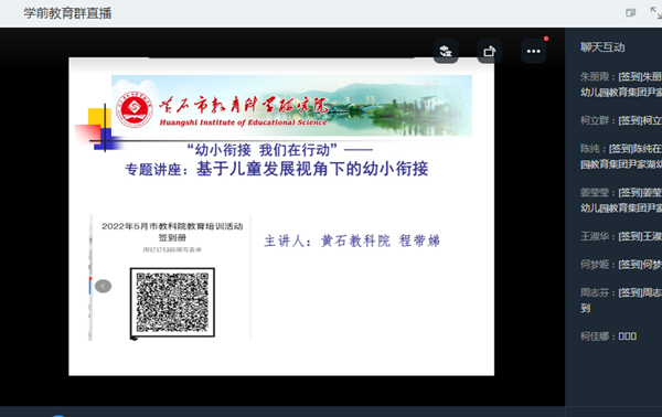 为全面做好黄石市幼儿入学准备和入学适应教育工作,确保该市幼儿顺利实现从幼儿园向小学生活过渡,5月25日上午,黄石市教育科学研究院学前教研员程带娣在钉钉平台组织了一场主题为“基于儿童视角下的幼小衔接”的专题培训。各县(市)区教研员和教师代表参加了学习。