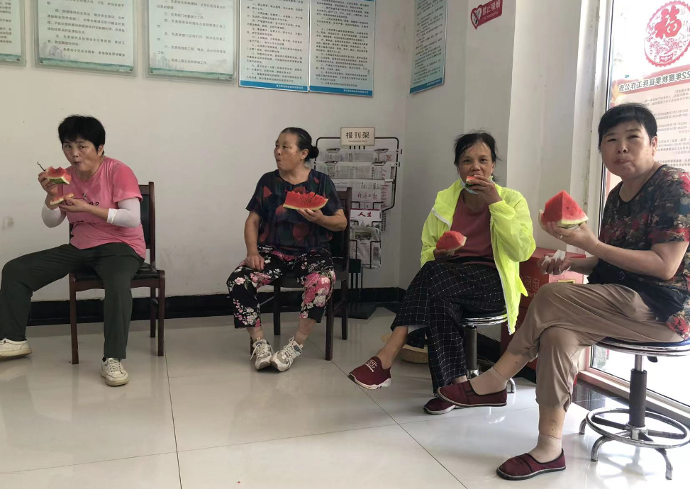 来到箭楼下社区怡康花园小区内纳凉点,刚忙完的保洁阿姨们正吃着西瓜感慨道,“这个纳凉点好啊,以前都是坐在树下休息,现在不仅有免费饮用水,天热了还有西瓜吃!”