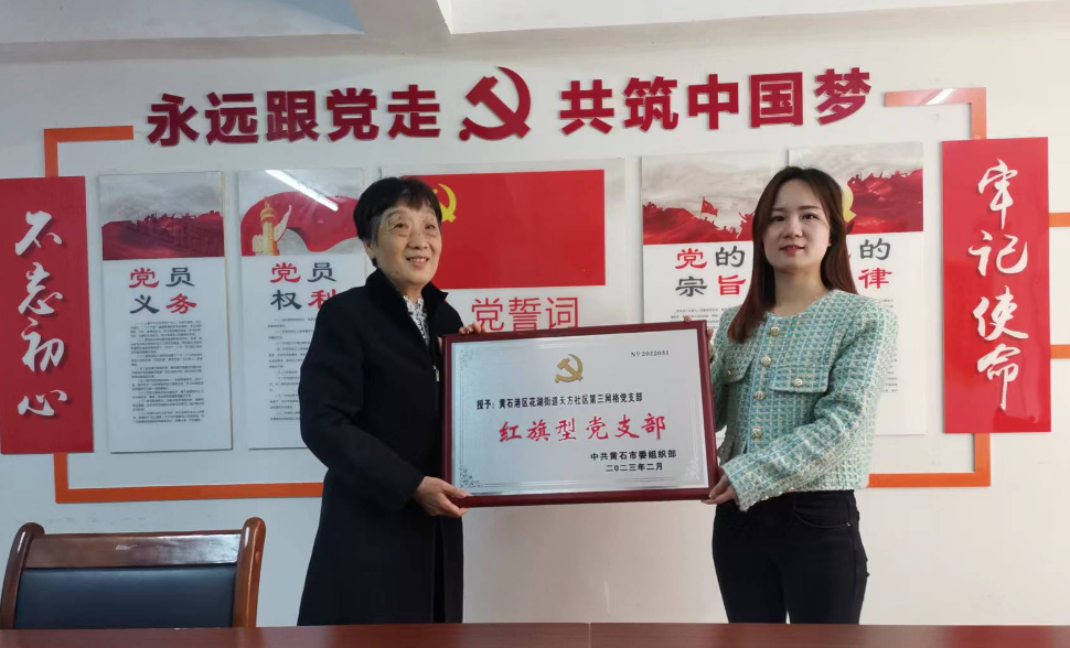 4月26日,春光明媚,黄石港天方社区第三网格支部那面“红旗型党支部”牌子熠熠生辉。
