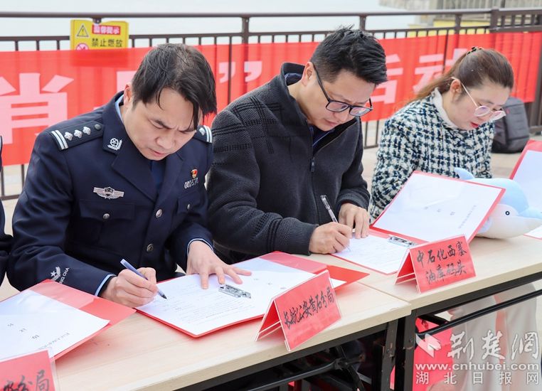 启动式现场,黄石市花湖小学学生代表向广大市民发出保护长江倡议。黄石市公安局黄石港分局、长航公安黄石分局、黄石港街道办事处、黄石日报小记者团、花湖小学以及多家临江、水上企业负责人共同签署了守护长江共建共治协议书。