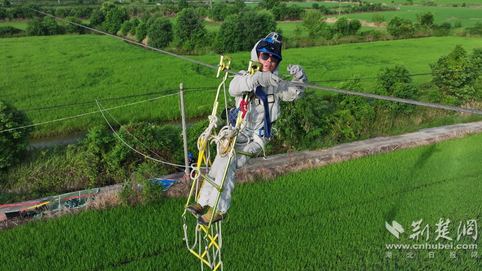 荆楚网(湖北日报网)讯(通讯员 曹祥魁)连日来,湖北黄石高温预警不断,电力负荷屡创新高。7月16日6点不到,国网黄石供电公司带电工肖勇带着5名同事,便已来到黄石大冶市陈贵镇胡中二村附近,开始为上空的110千伏栖前线带电修补工作做准备工作。