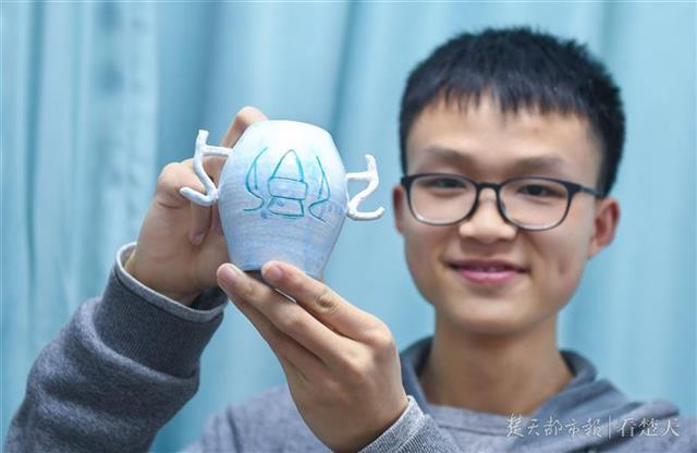 也有的作品没有和诗融为一体。周纳宇航带队完成的作品,非常巧妙,他们在泥塑店花100元做了个小陶罐,它的形状是甲骨文中的“卿”字。“这是上学期老师讲的,典型的会意字。两边是两个小人相对而坐,中间是一个食器,代表卿卿我我。”周纳宇航说,陶罐太小不能刻诗,但是该小组也创作了一首《乡间·飨会·与卿对饮》。不仅如此,小组中的文艺才女赵璇玉,还将这首诗谱曲配乐,自己演唱录成了音频。