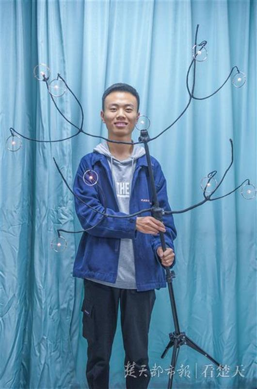 赵宇飞小组的作品是个一人高的“铁树”,它的外型是一个甲骨文的“桑”字,树枝上有十个可以点亮的灯泡。赵宇飞解释,《山海经》中记载着十个太阳住在扶桑树里的传说,他们用摄像机架和铁丝制作了扶桑树,用灯泡来代表太阳。