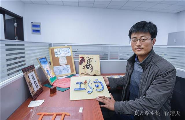 昨日,武大文学院教师工作室里堆满了手工艺术品,小的有陶罐,中型的有泥塑、石膏模型、剪纸、弦丝画,大的有铁艺装饰。大学生还玩这些中学生做的手工活?仔细一看,原来没这么简单——每个作品都是表现的一个古代汉字,不仅体现出字形,还还原了字意。不是经学生介绍,很难领会其中的奥妙。