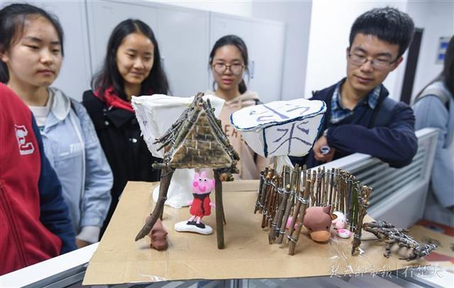 还有一个作品用树枝扎出了猪舍、牛圈,用以表现“家”和“牢”的来源,学生们的解释和诗词录制成了视频。提交视频的学生还不少,有人通过动画演示文字演变,还有的小组甚至排练了情景剧、相声。