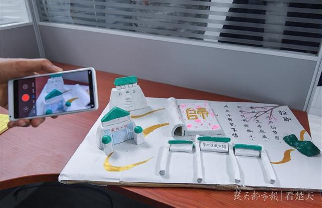 记者看到,每个作品还有一首配诗。如用石膏做的武大牌坊、老图书馆模型旁,有一首学生写的《归珈》:烟火三声归梦醒,春风十里步盈盈。何年凭眺樱城上,再笑今朝花下情。