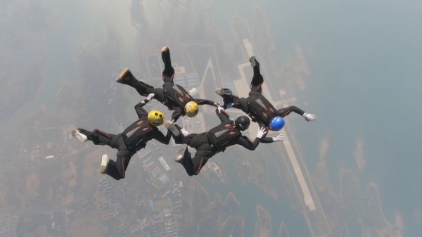 朱来明说,四人造型跳其实是5人跳,还有一名自己队的摄像师同时跳下,全程摄像,落地15分钟之内,视频必须上交,裁判根据拍摄视频里面的画面、动作等综合评分,这就对摄像师的要求很高,如拍摄的角度、与运动员的默契度等。