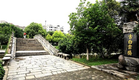 八、白云桥:横卧于荆沙河上的白云桥原名龙坡桥,始建于明嘉靖年间(1522年——1566年),清康熙年间重建时,因桥临近明孝子张廷贵墓,给桥命名时定为白云桥,取白云望亲之意。图为1986年重建的白云桥。