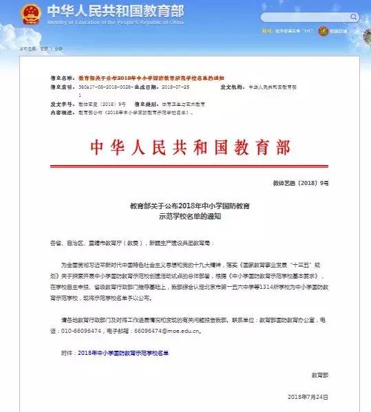 《关于公布2018年中小学国防教育示范学校名单的通知》