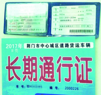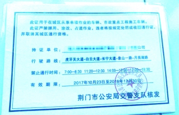 据李师傅介绍,他所在公司办得一张“2017年荆门市中心城区道路货运车辆长期通行证”,有效期限为“2017年10月23日至2018年12月30日”,行驶路线为“虎牙关大道—白云大道—长宁大道—象山一路—月亮湖路”,落款为“荆门市公安局交警支队核发”字样,盖有“荆门市公安局交通警察支队交通秩序管理科”字样的印盖。