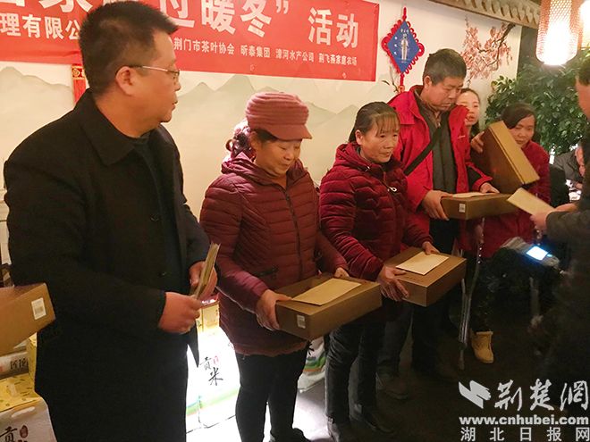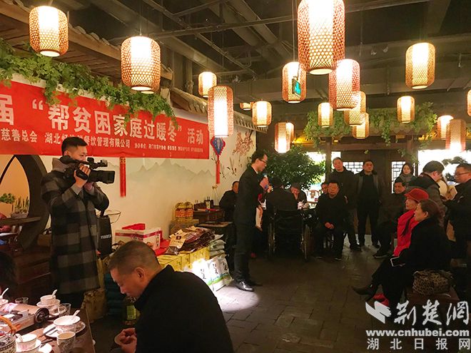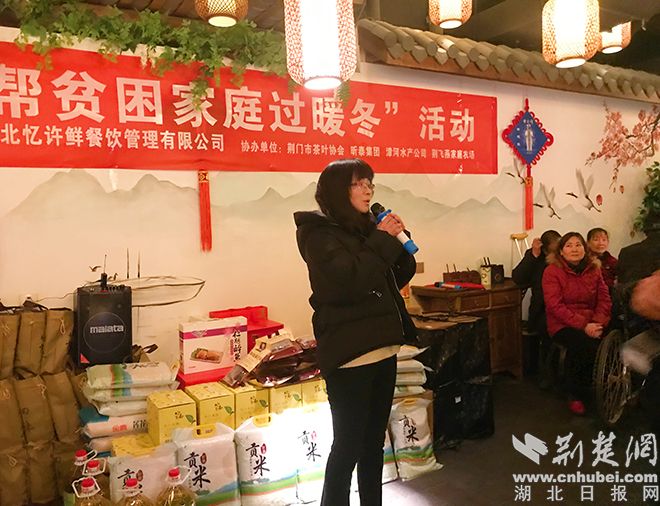 中午12点半,宴会正式开始,许新斌和荆门慈善总会的领导将事先准备好了年货和慰问金一一送到贫困户手中。忆许鲜餐厅特意为大家准备了丰盛的团年宴,让这些困难家庭,在这个冬天里,不再寒冷。