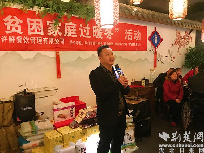 荆楚网客户端-荆楚网消息(记者 安从斌)1月22日上午,荆门第九届人民代表大会第三次会议隆重开幕,刚刚列席人大会议的荆门市政协委员许新斌在结束会议后,立刻驾车匆匆赶到自己的忆许鲜餐厅,因为今天他今天邀请了荆门20户贫困家庭提前吃团年饭,并为他们准备了丰富的年货。