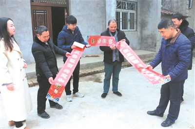 荆门日报讯(记者杨国良通讯员叶念念赵爽)1月24日上午,沙洋县沙洋镇友谊村4组贫困户熊小锋接到镇里和村委会干部送来的一份特殊新年礼物。他好奇地打开一看,原来是副春联,上联:敬业爱国同创文明,下联:友善诚信共建和谐,横批:勤劳致富。