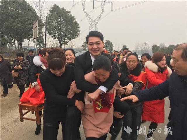 元月28日,湖北日报讯全媒记者在孙桥陈集村采访,目睹这一独特婚俗。25岁的新娘王雅是陈集人,迎娶的新郎从钟祥远嫁而来。11时许,迎亲车队停在离新娘家一公里路边,王雅的父母王峰、张宏与亲友早早等候,新郎邓任超一开车门,脚不离地,坐上丈母娘及其姐妹用手搭建的“软轿”。伴随阵阵锣鼓,鞭炮齐鸣,“软轿”朝前奔去。