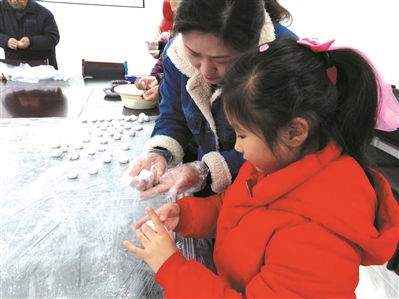 为了欢庆元宵佳节,2月15日下午,荆门高新区·掇刀区白庙街道五一桥社区组织辖区居民开展了“猜灯谜、包汤圆、闹元宵”活动,促进邻里间交流。图为当天居民在该社区活动室里教孩子包汤圆。方丽荣刘亚娟摄