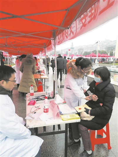 在靠近广场中间偏北的地方,有几顶帐篷下的展台和其他帐篷的展台稍有不同,这里不提供用工咨询等信息,而是向过往的求职者发放健康礼包、避孕药品并接受健康咨询等。这支“把健康带回家”流动人口卫生计生关怀关爱专项行动服务队的队员来自市卫生计生委、市二医、市疾控中心、市计划生育药具站等单位,他们在夹杂着雨雾的寒风中不停地忙碌着。