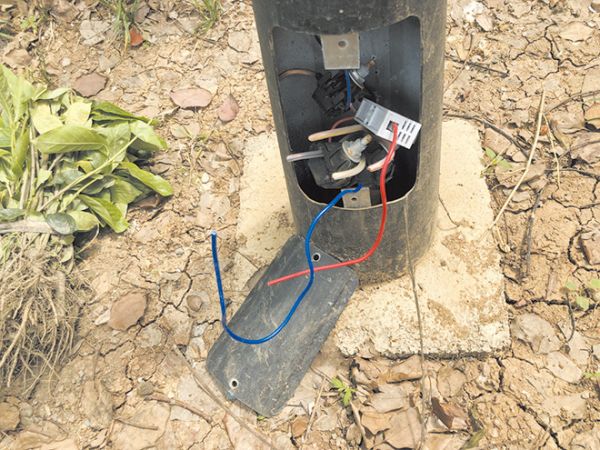 昨日上午,记者在沿河路苏畈桥——金虾桥右岸路段看到,黑色的路灯十分美观(图1),但路灯下方埋设电缆的盖子全部掉在地上,路灯杆里面连接路灯之间的铜芯电缆被剪断盗走(图2)。