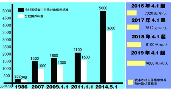 1986年至2001年,荆门市实行农村五保金乡镇统筹,五保对象的供养标准依据统筹金额确定,并在党和政府的重视和关怀下,供养标准大幅提升——1986年,集中供养和分散供养对象每人每年的供养标准仅两三百元,到2007年,供养标准提高至上千元/年/人,特别是十八大以来,连续多年提高供养标准,到2019年已经达9000元/年/人,农村五保对象的幸福指数大幅提高。(记者 杨涛 通讯员 龙克华/文 李柬/制表)