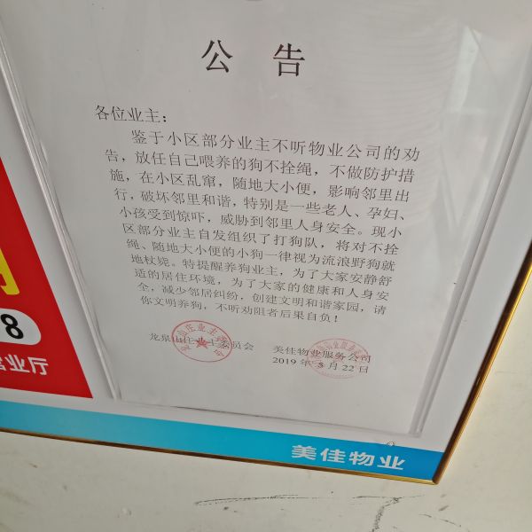 在小区每栋单元楼一楼,张贴着提醒业主文明养犬的公告(如图),引发业主强烈关注。该公告由龙泉山庄业委会和美佳物业服务有限公司共同制订,时间为今年5月22日。大致内容如下:鉴于小区部分业主不听物业公司的劝告,放任自己喂养的狗不拴绳,不做防护措施,在小区乱窜,随地大小便,影响邻里出行,破坏邻里和谐,特别是一些老人、孕妇、小孩受到惊吓,威胁到邻里人身安全。现小区部分业主自发组织了打狗队,将对不拴绳、随地大小便的小狗一律视为流浪狗就地杖毙。特提醒养狗业主请文明养狗,不停劝阻者后果自负!
