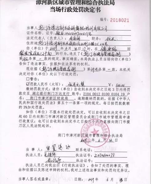 漳河新区查处街头乱发小广告行为:近日来,漳河新区城管局执法人员在万达广场周边巡查时发现有人在散发广告宣传单,对其进行劝阻并宣传城市管理相关规定,但该人员拒不配合管理,暴力抗法。该局执法人员依法对其发放的广告宣传单进行暂扣,并依照《荆门市城市管理条例》相关条款实施行政处罚,罚款500元,严厉打击街头乱发小广告违法行为,具有典型效益。市城市治理工作领导小组办公室决定对该局予以通报表扬,并以此作为6月份城市管理月度考评加分依据。