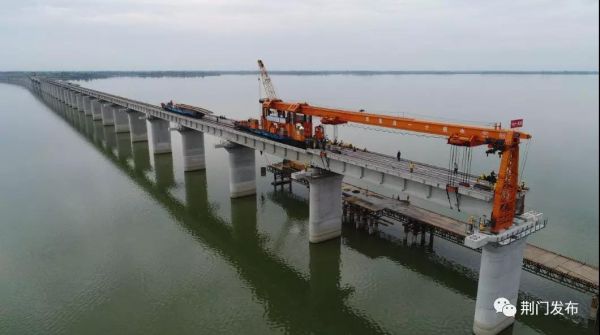 2018年12月3日,经过425天的艰辛施工,蒙华铁路跨长湖特大桥悬灌梁顺利实现合龙。长湖特大桥全长4022.56m,有桥墩台119座,31#-33#主墩悬灌梁全长321.5米,跨越长湖Ⅲ级航道,是蒙华铁路湖北段最大的水上连续梁。