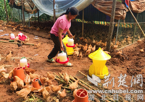 在东宝区仙居乡柴黄村,网络媒体记者一行见到了朱顺泉的妻子彭友珍,此时,她正在给自家养殖的土鸡喂食。