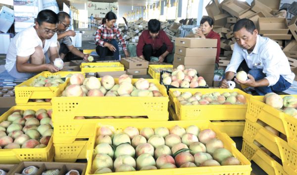 7月以来,东宝区圣境花谷景区内,220亩水蜜桃陆续进入成熟期“。今年桃园预计产量30至50万斤,已销售近10万斤,相比往年,我们今年首次通过微信小程序‘、松鼠拼拼’、社区团购网等电商平台销售水蜜桃,拓宽销售路径,目前产品供不应求,远销广州、深圳、武汉等地,最高峰一天发送快递1200多件。”圣境花谷景区负责人曹光说,水蜜桃销售好,不仅景区收益,也带动周边村民就业,每天至少有40名子陵铺镇金泉村村民在这里务工。图为工作人员现场挑拣、装箱水蜜桃。 方丽荣 张兆宇 摄