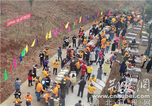 荆楚网客户端—荆楚网消息(通讯员 郭树莉 王映来)“开笼啦!”伴随着一声响亮的吆喝,荷叶包鸡、鱼糕、香菇蒸鹌鹑蛋、锅盔蒸带鱼等一个个热气腾腾的巨型竹制蒸笼呈现在1000多名游客面前,这是12月1日在京山市曹武镇石桥村举办的首届“笼宴节”的热闹场面。