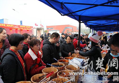 在商品展示区,商家们纷纷亮出自己的看家产品,新市的铁皮石斛,钱场的霉千张,永兴的甲鱼,三阳的板栗,绿林的香菇,杨集的葛粉,坪坝的油面,孙桥的桥米,石龙的鹿血酒......各地名优土特产组成了一道道华美的年货盛宴。