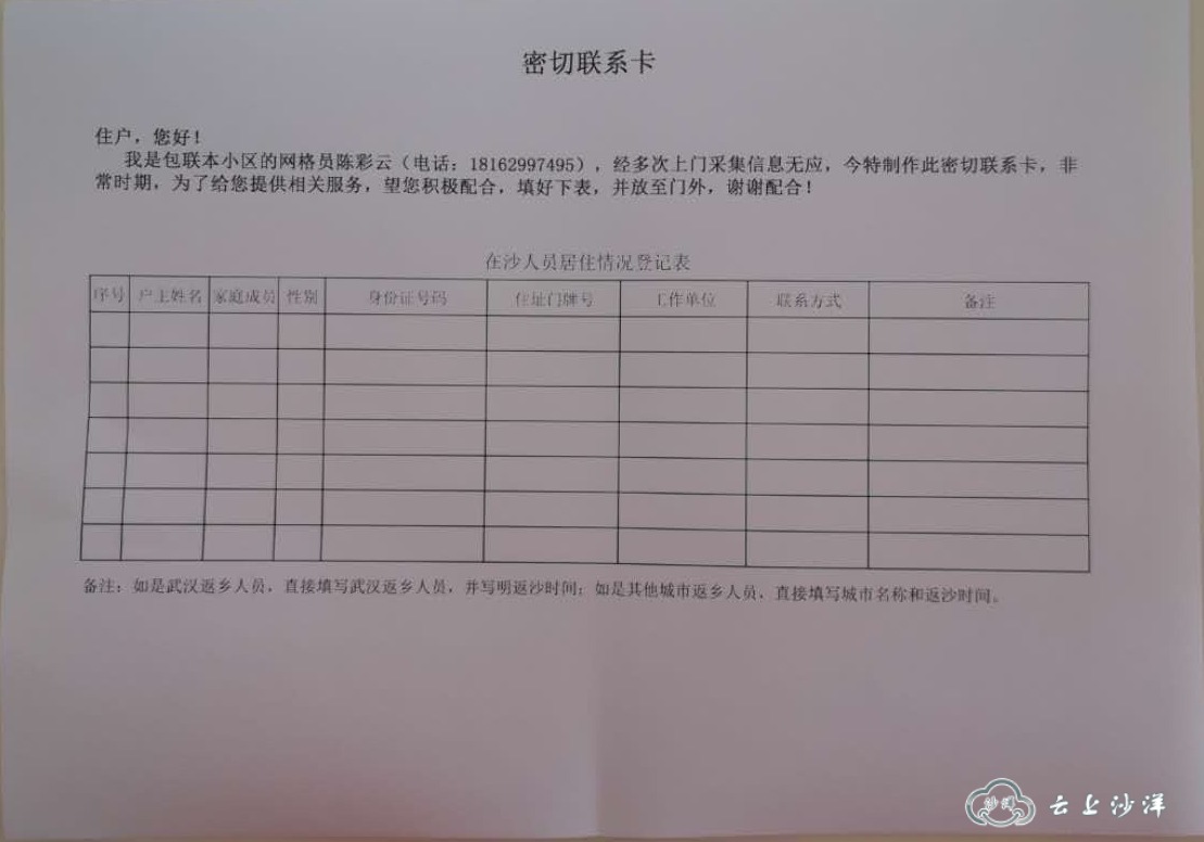 针对住户担心网格员入户防护问题,经过认真思索,陈彩云想到了一个好办法,她制作了一张“密切联系卡”,上面清晰明了的记录了她到访的目的,并在卡上设计了住户基本情况统计表,还附上一些政府关于对不如实报告实情群众的处罚规定,用塑料袋装好后挂在居民门把手上,由居民自取“密切联系卡”如实填写后挂回门把手。几小时陈彩云返回收取资料。“密切联系卡”温暖了所有居民的心,大家都积极配合,完整地填写了疫情防控所需信息。