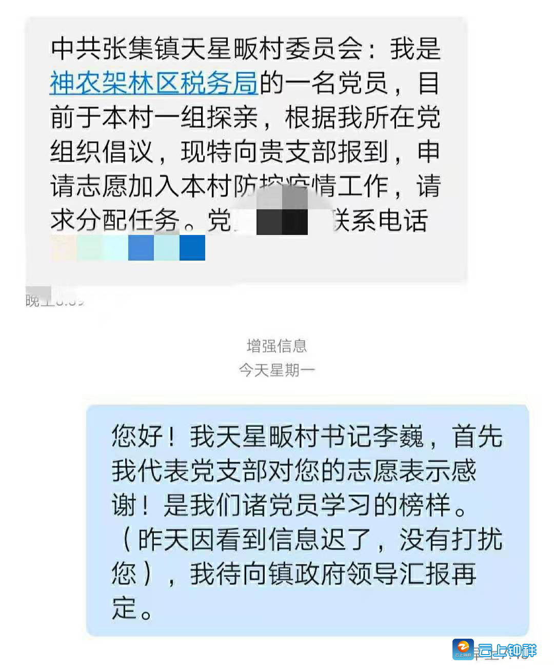“李书记,我是神龙架林区税务局的一名党员,年前到本村探亲后滞留,现在防疫形势严峻,我也想加入到村里疫情防控的队伍,请求党组织批准”,这是张集镇天星畈村党支部书记李巍收到的一条信息。“长河村党员胡金涛报到,我有车,愿意帮忙运送防疫物资”,“薛店村党员李纯报到,我刚退役没几年,身体倍儿棒,愿意到村里的交通卡点值班”,“张集社区入党积极分子陈江洲报到,我愿意协助社区参加大走访”......一句句朴实的语言让人感动,面对疫情,他们主动请缨,要求到防控的一线践行自己的入党誓言。