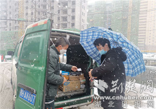 荆楚网客户端—荆楚网消息(记者 安从斌 通讯员 许华春、张扬)2月15日,气温骤降,荆门邮政的工作人员在风雪中为沙洋市民刘先生送上了订购的奶粉,解决了刘先生的“燃眉之急”。