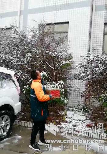 “三栋二单位301的住户,我是荆门邮政的快递员,请您戴好口罩下来取包裹。您放心,我很帅,也很健康,戴好口罩下来拿包裹啰……”市民张先生听到喊声,赶紧戴上口罩下楼。看到浑身是雪的快递小哥,张先生不好意思地说:“现在道路都管制了,又下这么大的雪,原本想着这邮件一时半会儿肯定是收不到了,没想到你们这么快就送到小区来了,真的是太感谢了。”