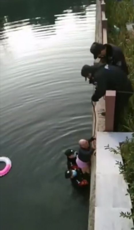 此时,离岸4米的河水里,一名女性老人在水中挣扎,浮浮沉沉。来不及多想,海慧警务站教导员、支部副书记董坤林来不及脱衣就跳入水中,紧跟着中队长张雪峰也跳了下来。两人奋力托起老人,艰难地往岸边移动。