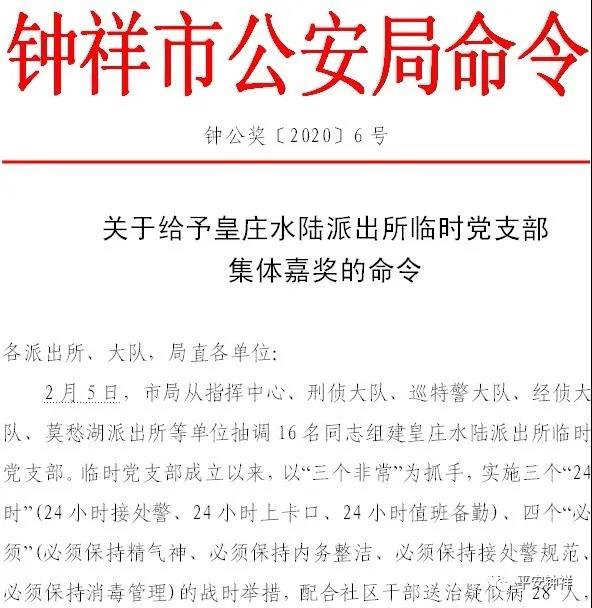 1月26日,钟祥市公安局在全警发布《战时动员令》,号召广大党员民警冲锋在前、做出表率。24个道路卡口民警值勤点,11个医疗场所、留观场所等民警值守点,成立临时党支部(党小组),组建青年先锋队,冲锋在前,攻坚克难。