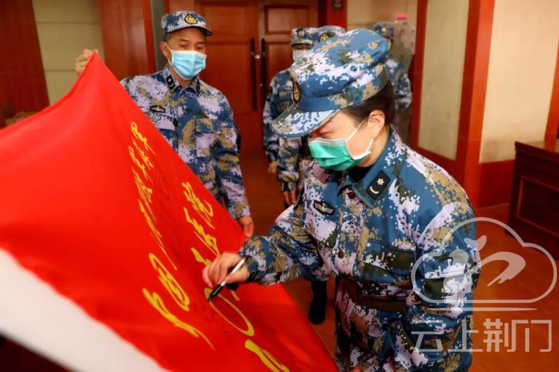 ▲出征前,杨霞在医疗队队旗上郑重签名